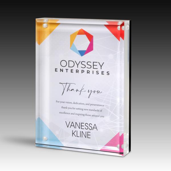 Our Unique Stand Out Digital Color Entrapments consist of two acrylic pieces held together by very strong magnets. You can mount any photo or printout of your choice between the layers, and our laser engraving option provides a frosted finish for excellent contrast. Additionally, our full-color printing option adds a vibrant touch to your artwork. Whether you want to recognize an outstanding employee, a top-performing student, or an exceptional team, our acrylic award is the perfect way to show your appreciation.